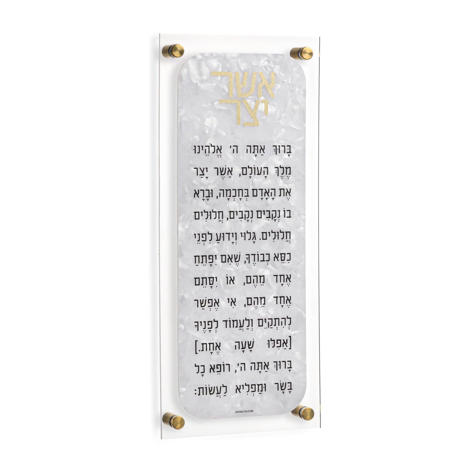 Crafted from clear acrylic and topped with a pearl marble plaque, this piece beautifully balances modern clarity with classic sophistication.Featuring beautifully die-cut metallic lettering, it adds a serene and dignified touch to any space. Clean, clear, and thoughtfully crafted, it honors the powerful daily bracha (blessing) of Asher Yatzar, reminding us to pause with gratitude. A meaningful addition to the Jewish home or a beautiful Judaica gift for any occasion.