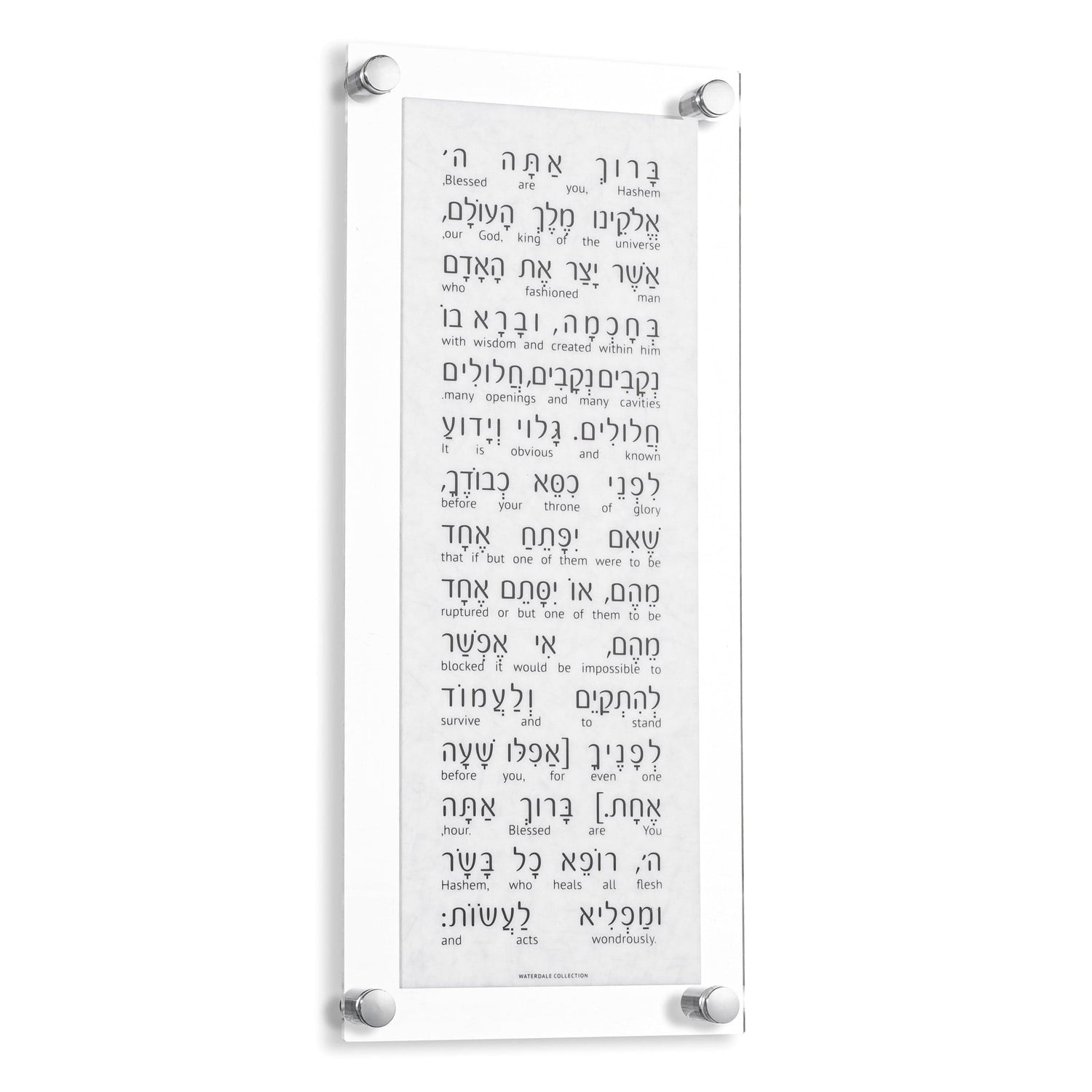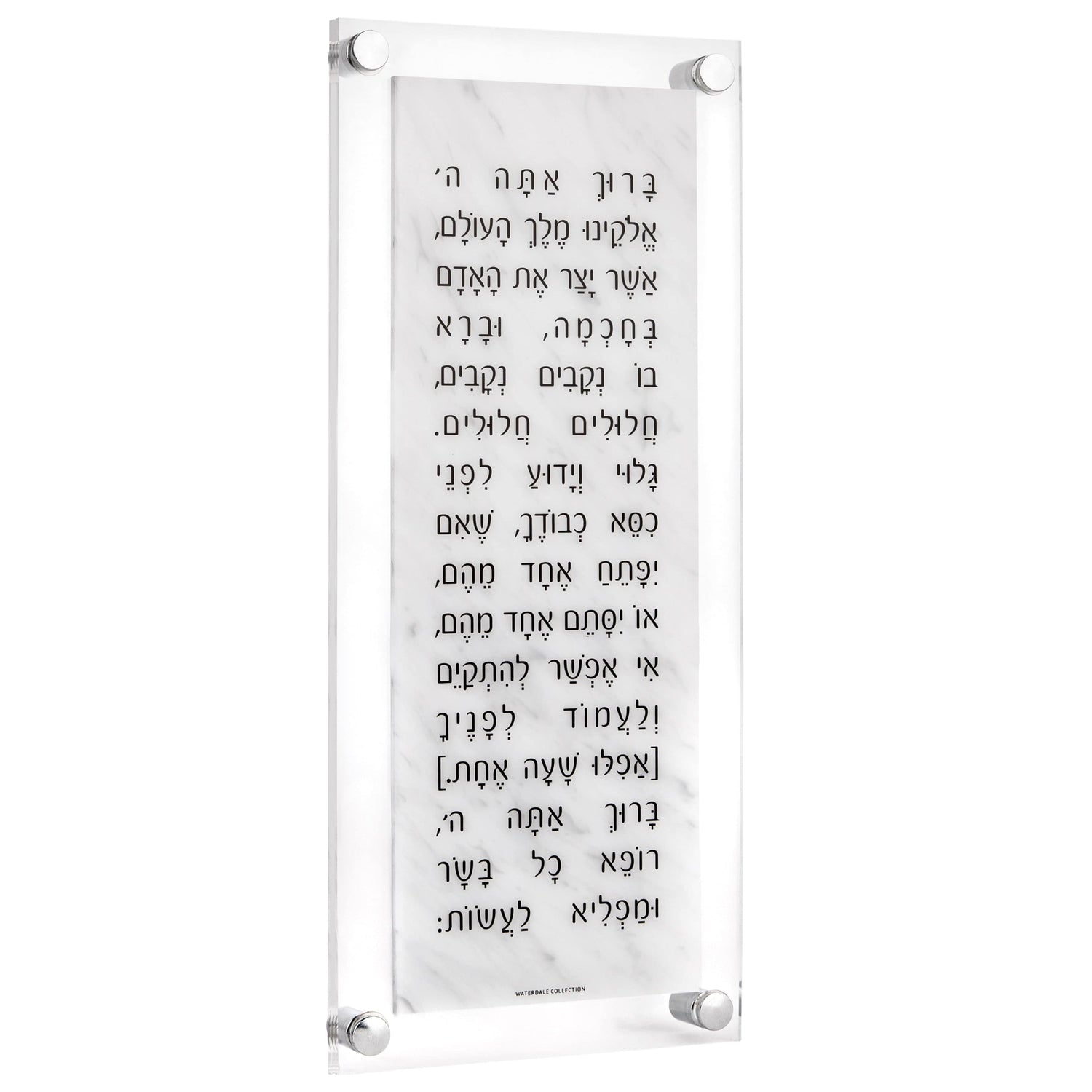 The Marble Asher Yatzar brings a luxurious new look to a timeless tefillah. Featuring a stunning marble-look lucite layer over thick, crystal-clear lucite, this piece offers an easy-to-read layout with a graceful, modern aesthetic. A perfect fusion of contemporary elegance and classic style, it enhances any space—whether your home leans transitional, modern, or traditional.