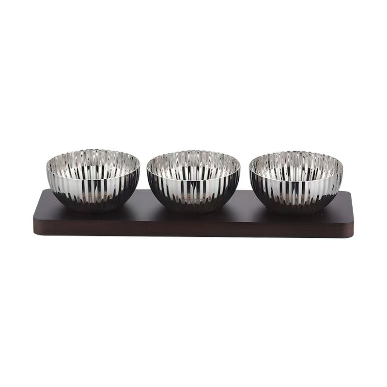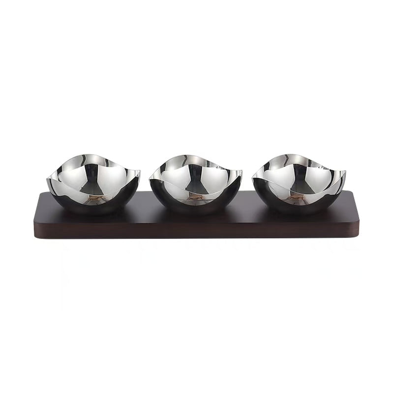 Made of durable stainless steel, these bowls are designed in a unique shape and come on a wooden tray for an exquisite touch. Elevate the dining experience with this beautiful dip bowl set.