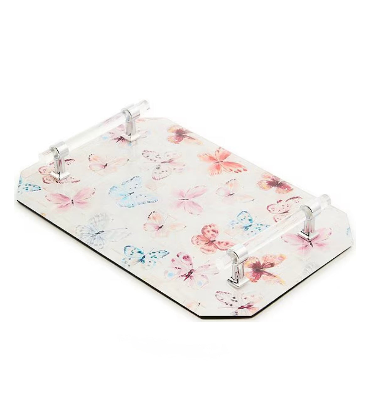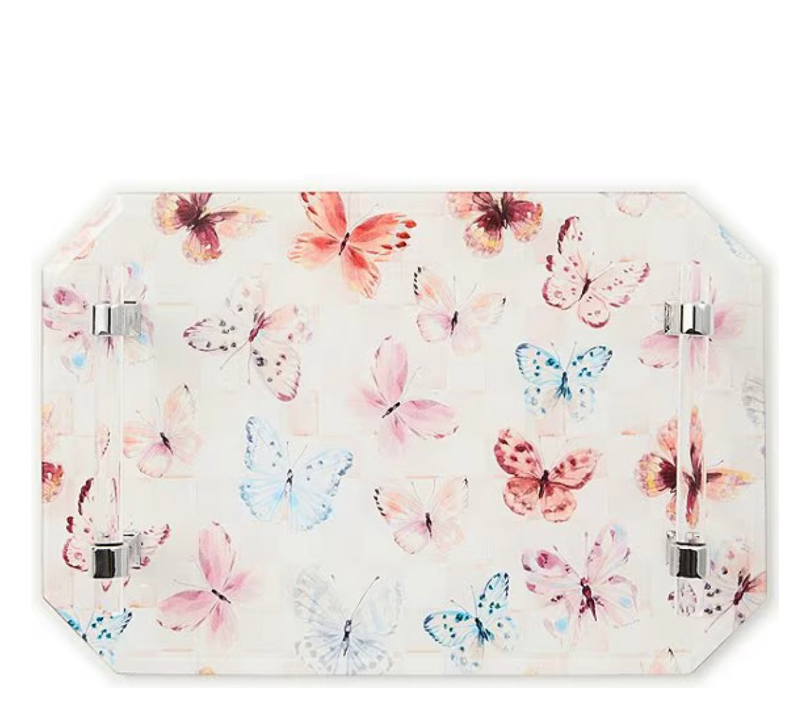Display with delight on this pretty and practical jewelry tray that features a print of butterflies and pink checks under glass. It’s trimmed with sleek acrylic handles.
