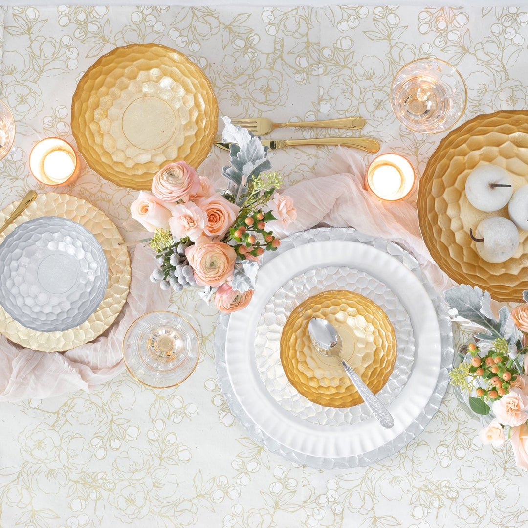 The Rufolo Glass Gold Honeycomb Medium Bowl brings luster to your table. The glass piece features an organic, striking honeycomb pattern, and the final result makes a glimmering statement.
