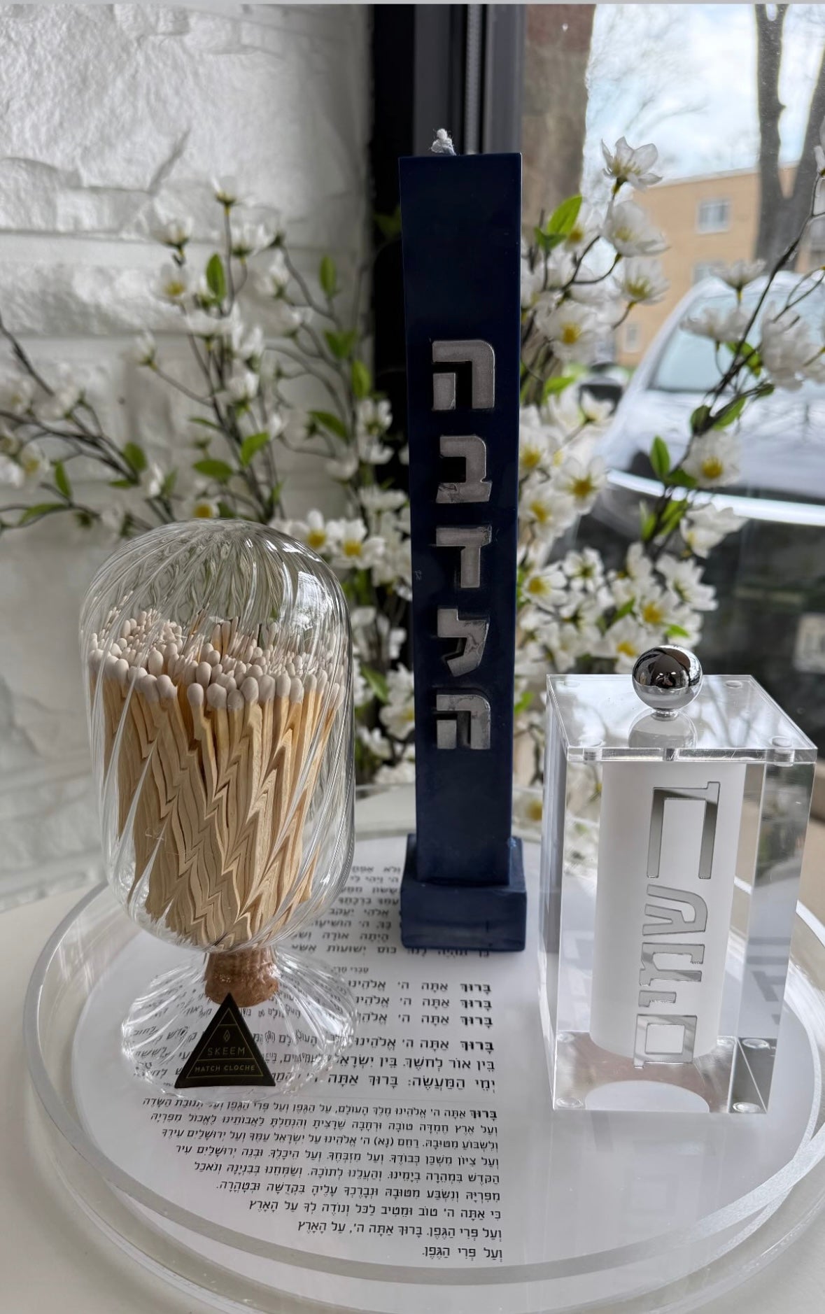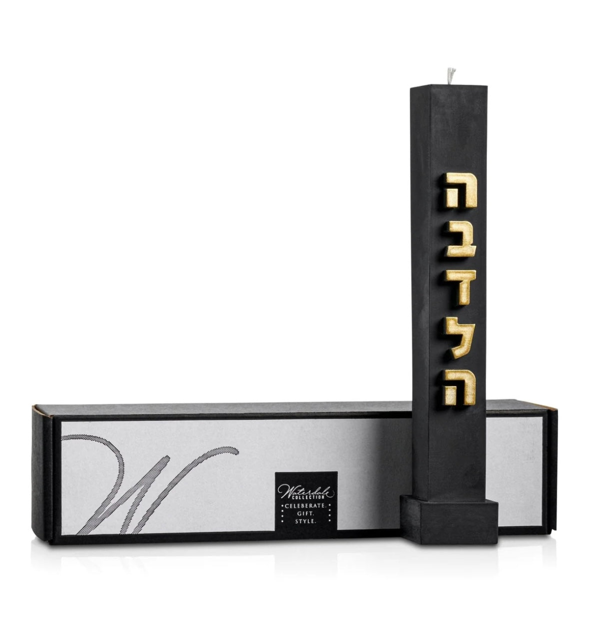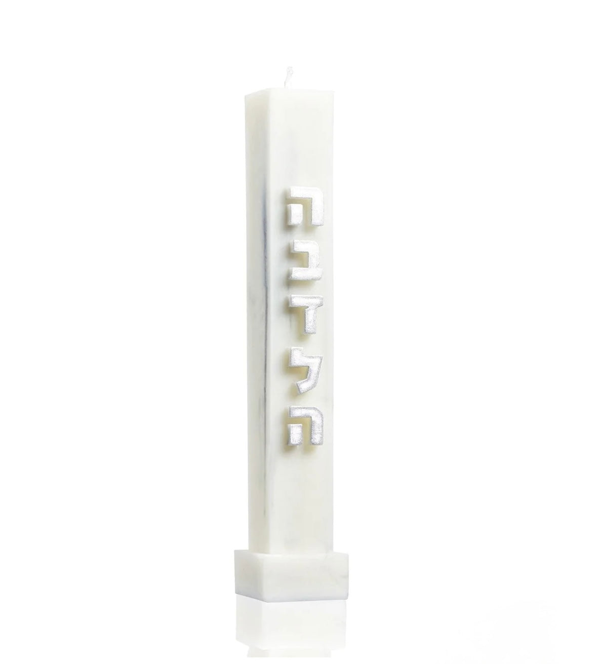 This magnificent luxe freestanding Embossed Havdalah Candle will make a striking addition to your Havdalah table. Display and use your Havdalah candle in style! Features embossed words הבדלה. Embellished with metallic gold or silver. Stunning. Smart. Comes in a beautiful gift box ready to gift.