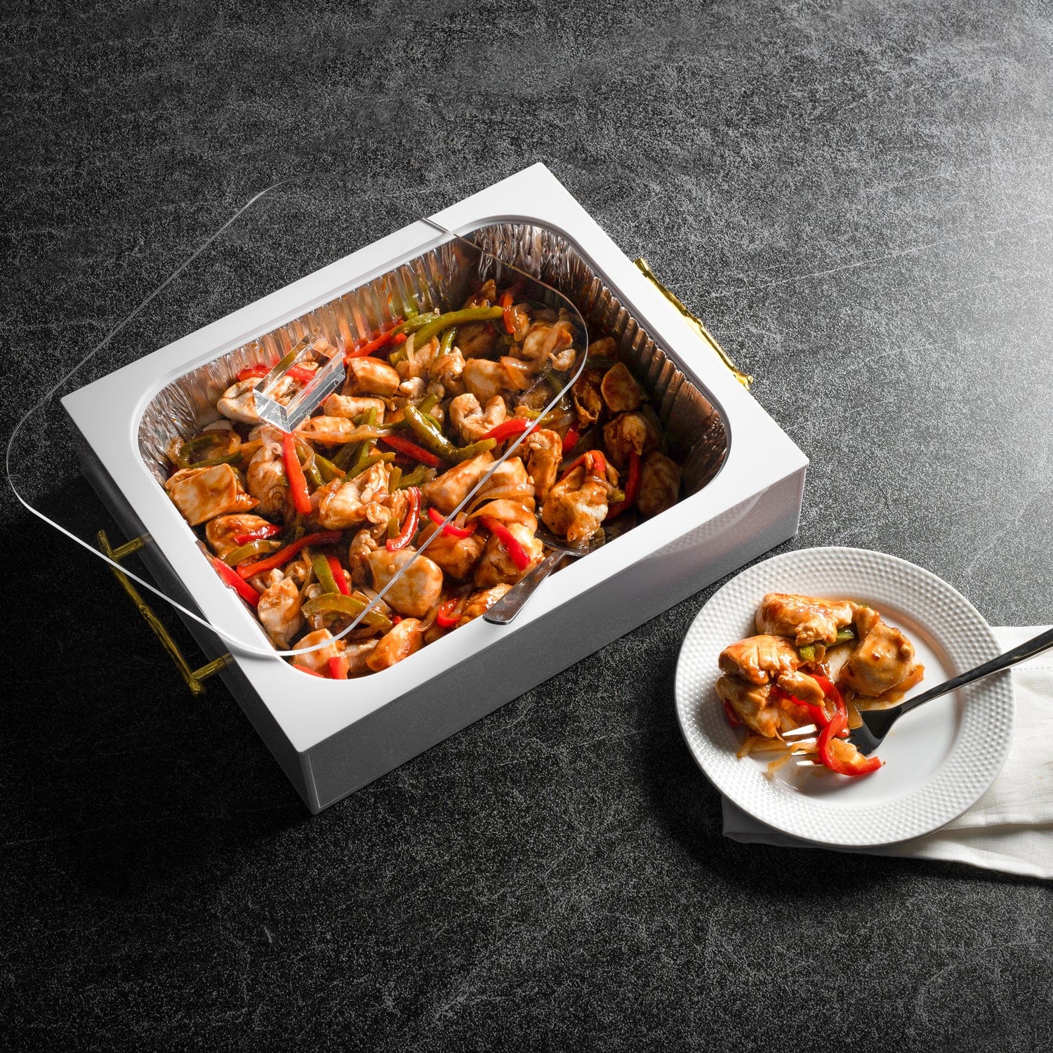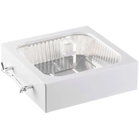 Place your filled 9x13 disposable pan directly into the dish. Then hide the rim with the second lucite layer, keeping your disposable pan totally out of site. Use the clear lucite lid to cover your dish and keep your food warm.