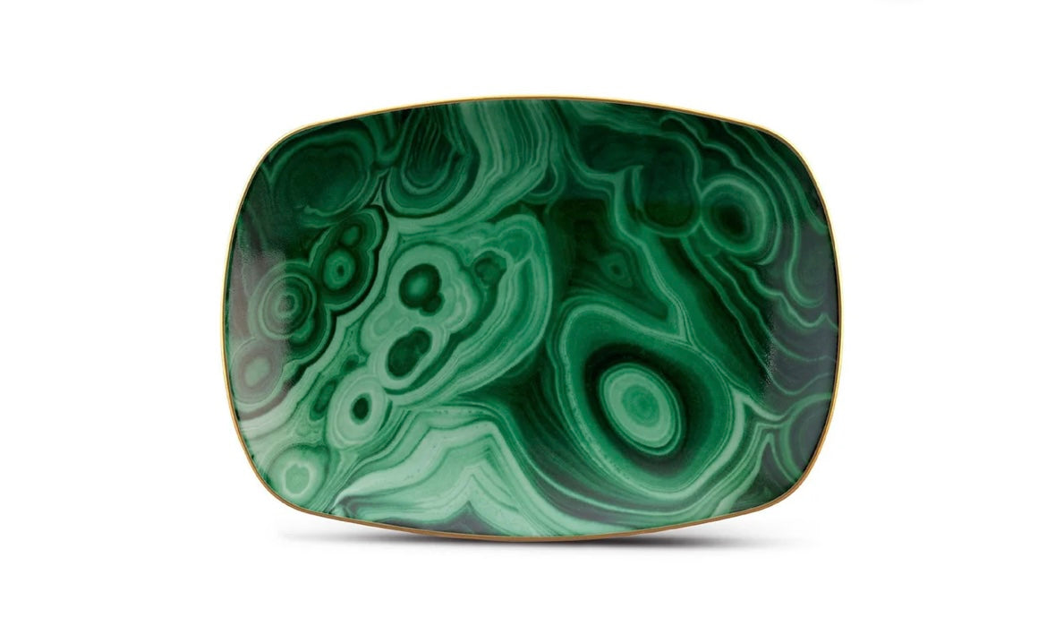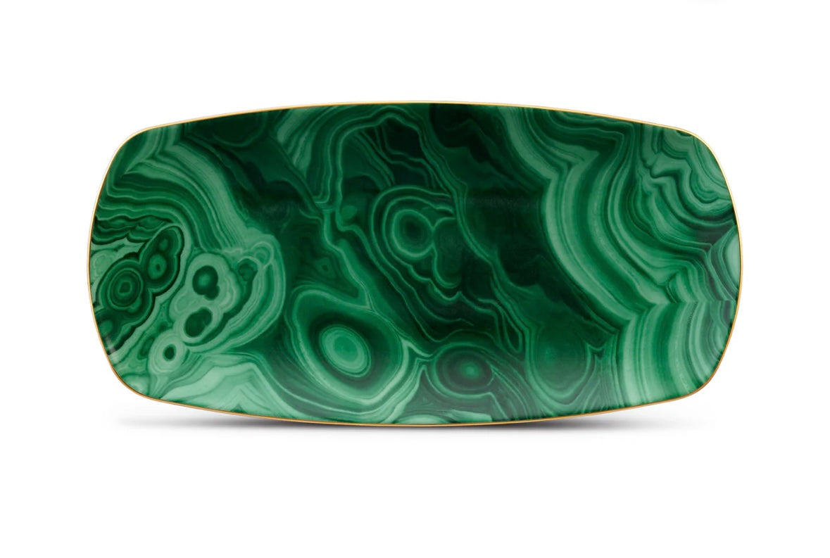 The striking bold of this Malachite tray design brings a sophisticated energy to any space. Made of porcelain with 24K gold accents and ideal for tabeltop or for decorating and organizing your workspace or vanity.