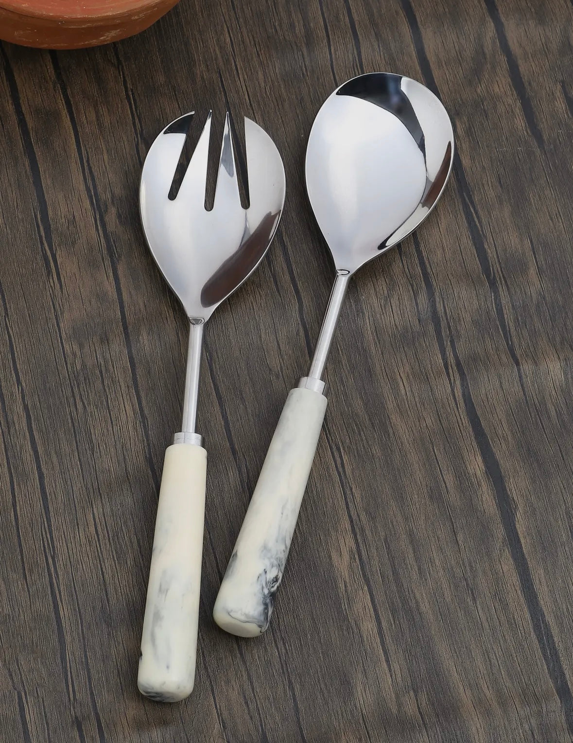 Contemporary in design, their marble look-a-like resin handles feature unique markings throughout. Darkened, brushed metal gives these essential kitchen accessories a stylish and modern look.