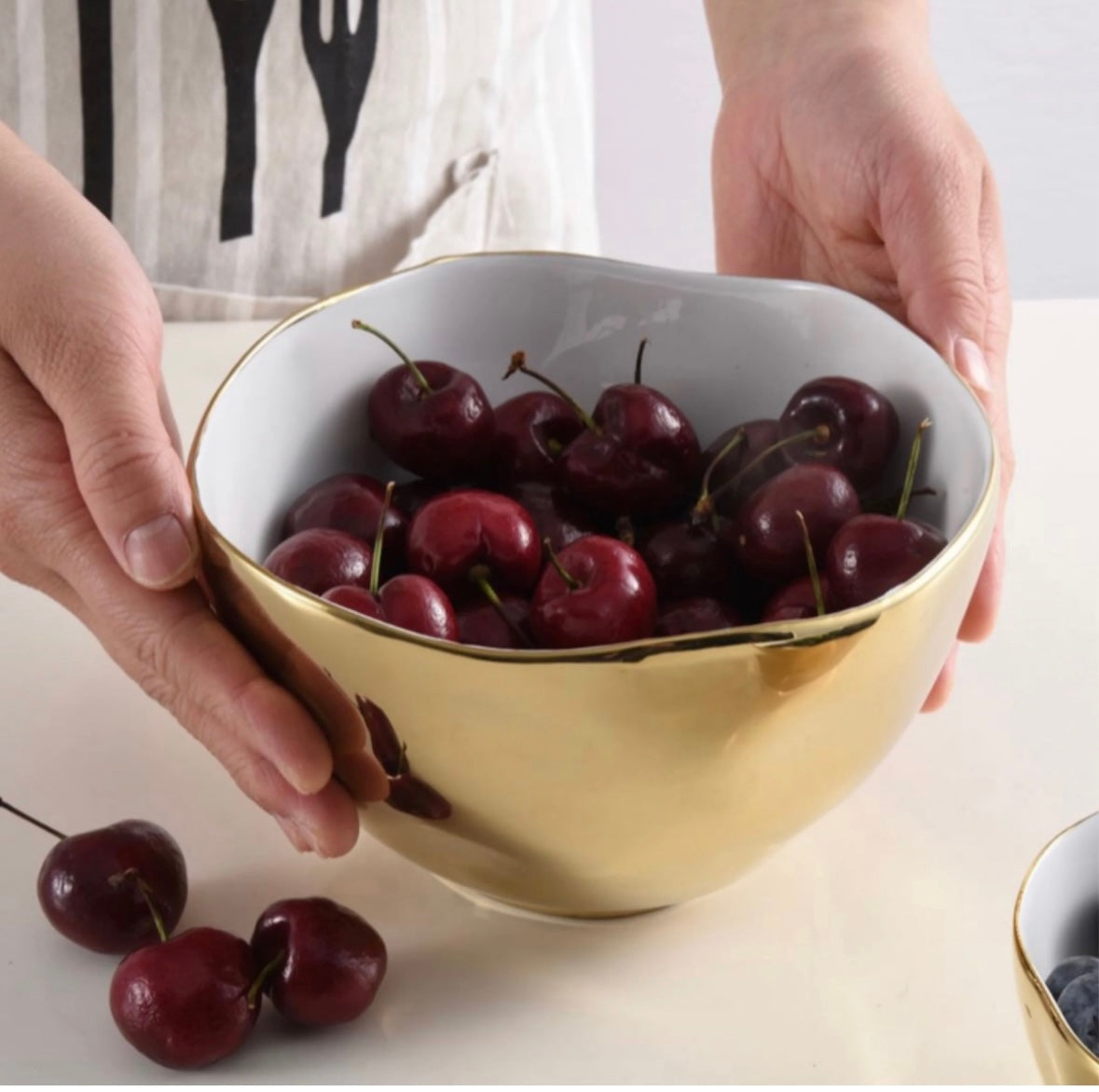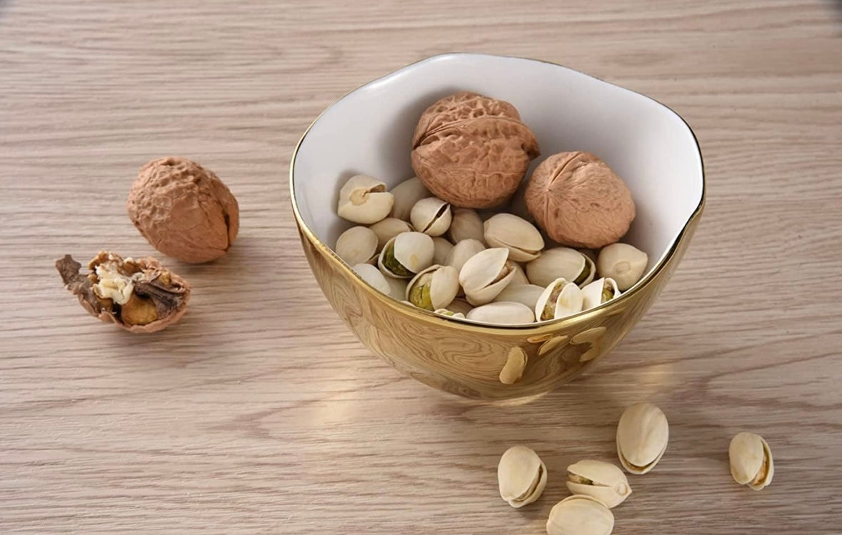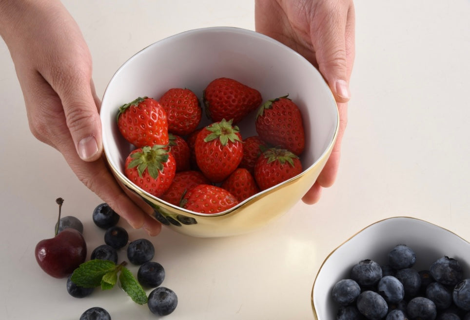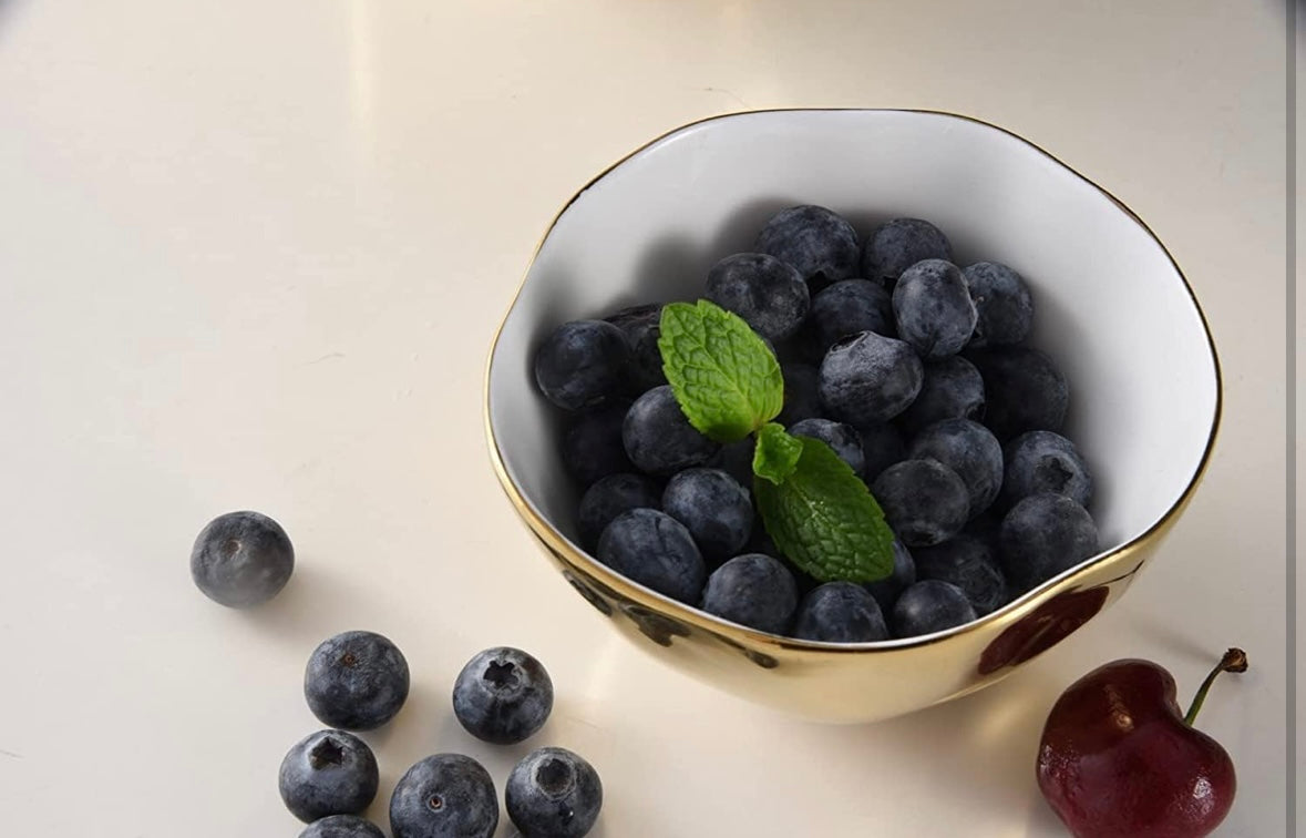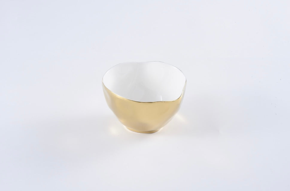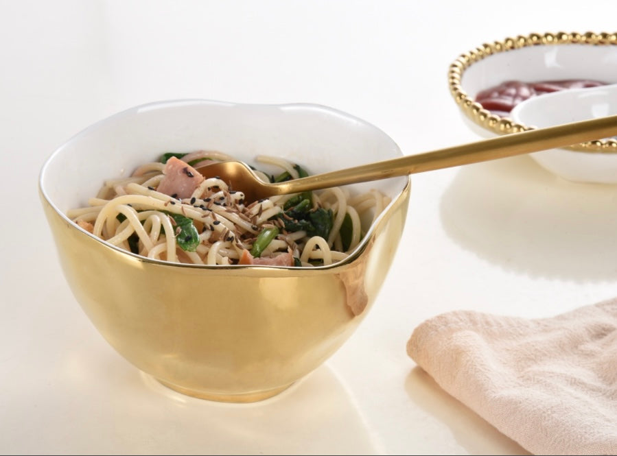 Porcelain serveware with a gold titanium-finished rim with an oven-safe layer for extra durability. Oven and dishwasher safe.