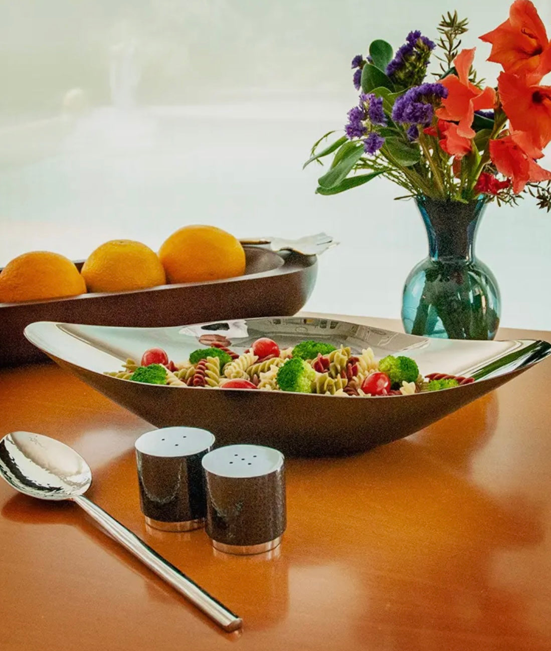 Northstar Oval Bread Bowl w/ Black Nickel captures the mid-century style and an ultra-modern feel. The black nickel finish over high polished 18/8 stainless steel is handcrafted. The Northstar Collection is sleek and functional.