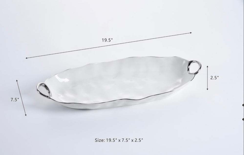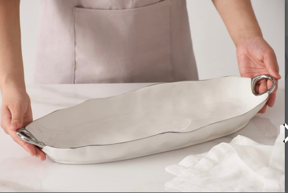 This platter is great for serving!!!Asparagus, carrots, green beans, even a whole fish all are stunning on this piece. Gleaming white porcelain with smooth and graceful handles in silver titanium. Food safe. Dishwasher safe. Oven safe to 500°. Easy Care.