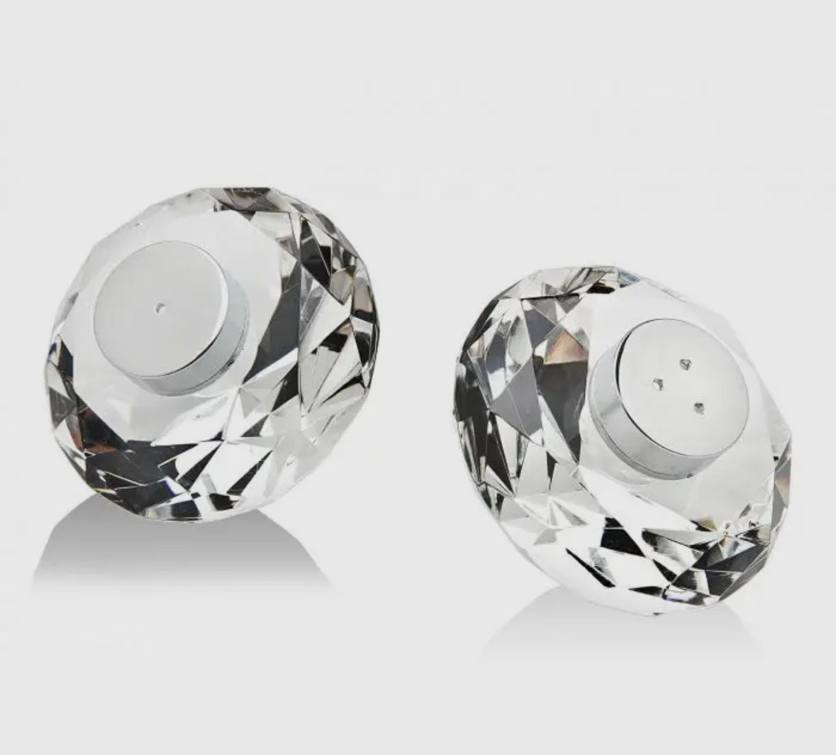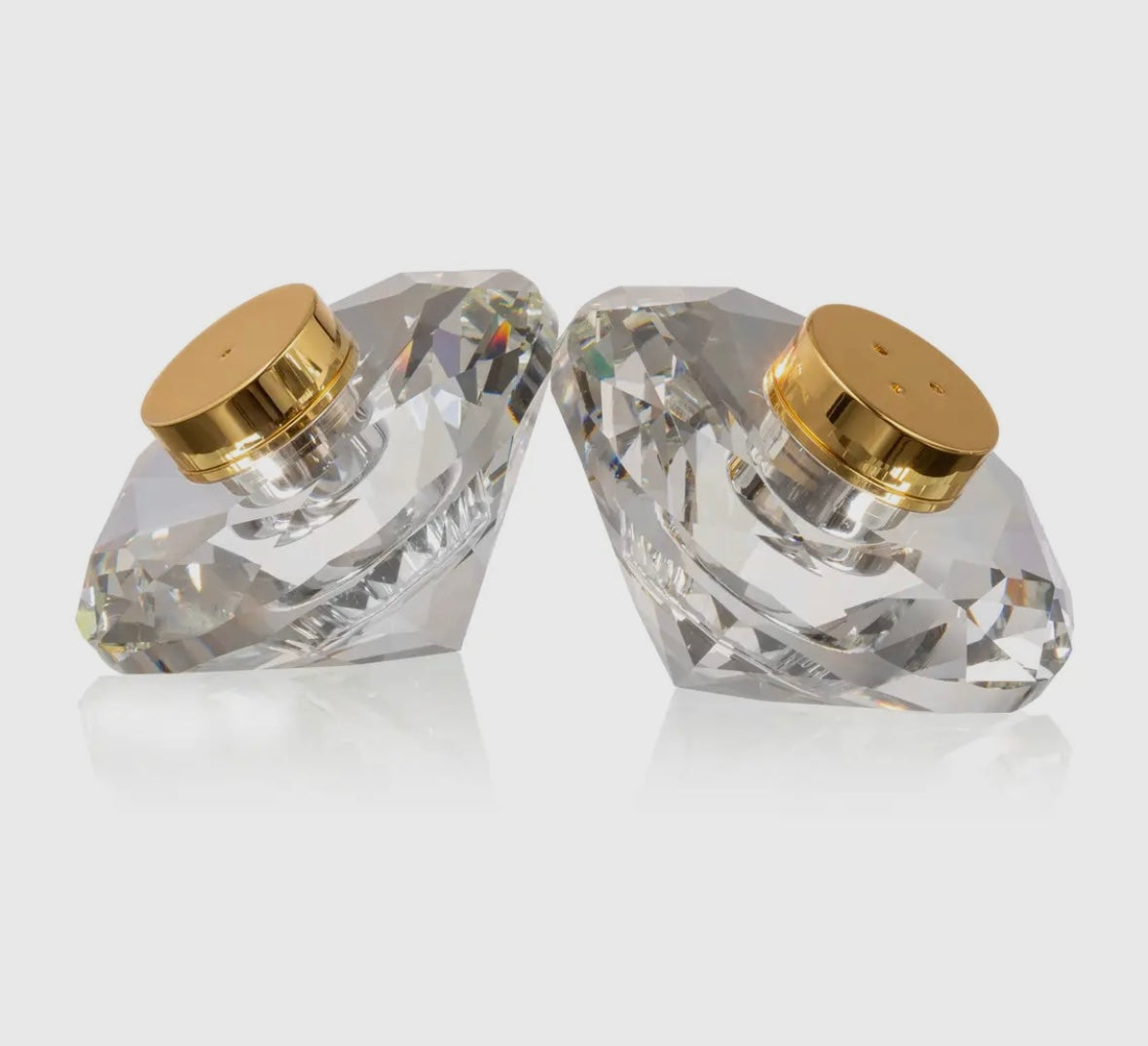 This rounded short salt and pepper shaker set ensures maximum potency and flavor in each shake. Semi-Handmade Imported Material: Unleaded Crystal & Stainless Steel Color: Clear & Stainless - Gold finish Overall Dimensions 2.76"L x 2.76"W x 1.85"H