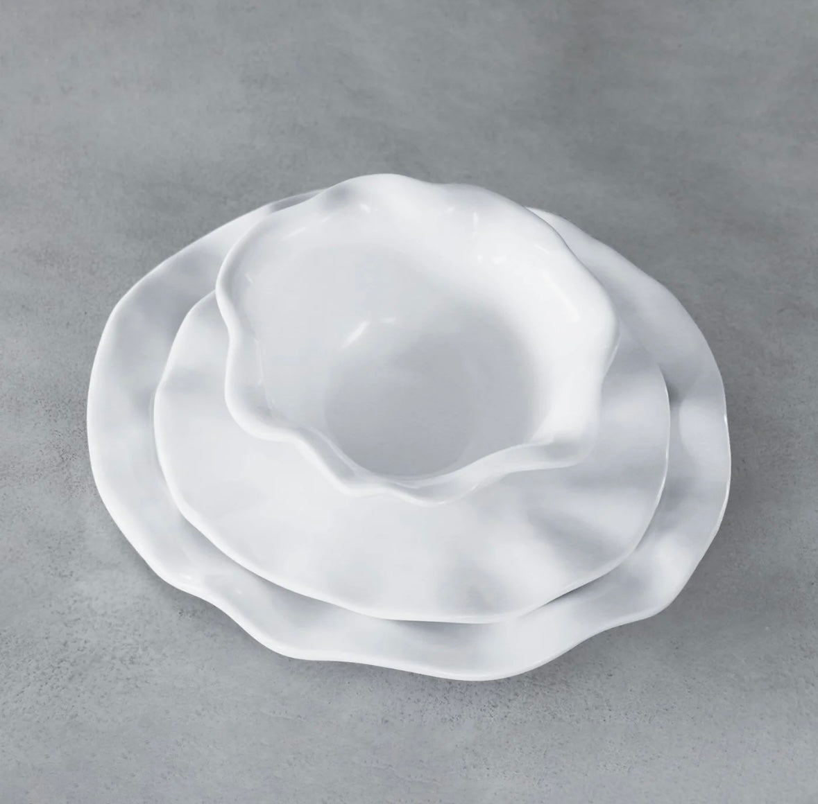The VIDA Havana Dinnerware is a favorite! With a perfectly irregular shape and a brilliant white surface. The round dinner plate is 11', salad plate 9" and a 7" cereal bowl--for a coordinated serving set. Sold in sets of four. Made of luxury melamine for everyday enjoyment, this piece is ideally suited for indoor and outdoor entertainment. Dishwasher safe (top rack), heavy-weight, food safe, BPA and PABA free.