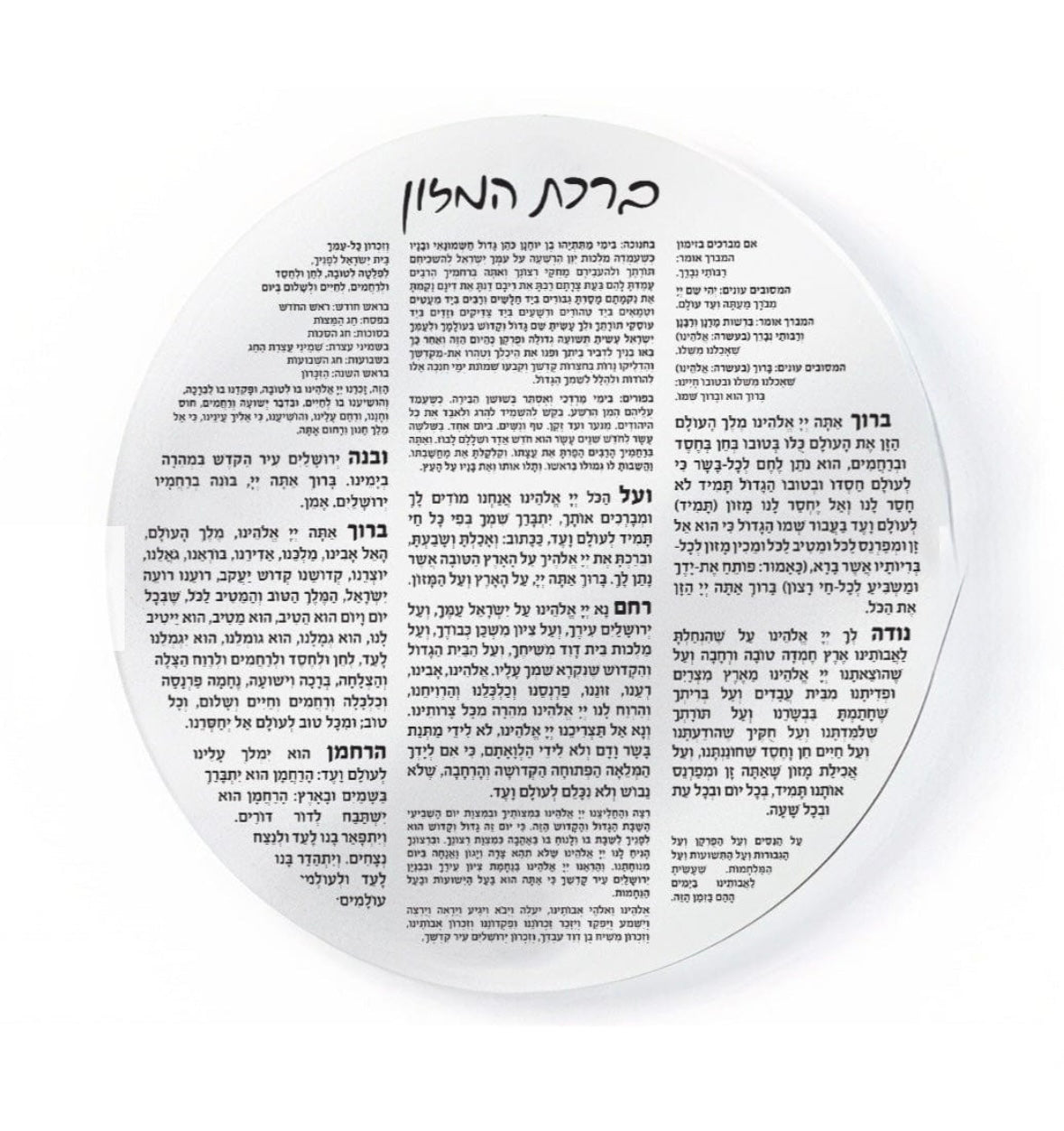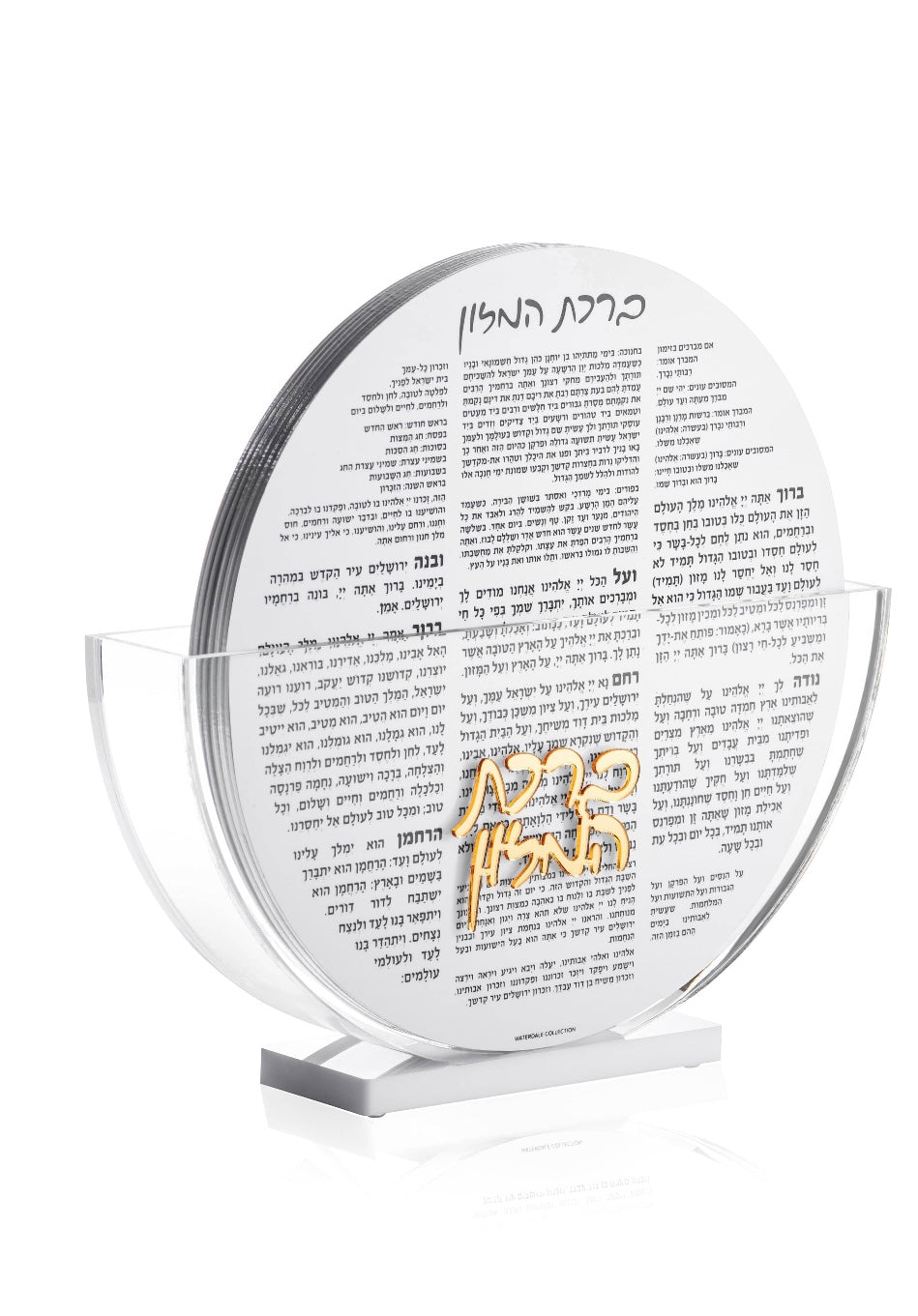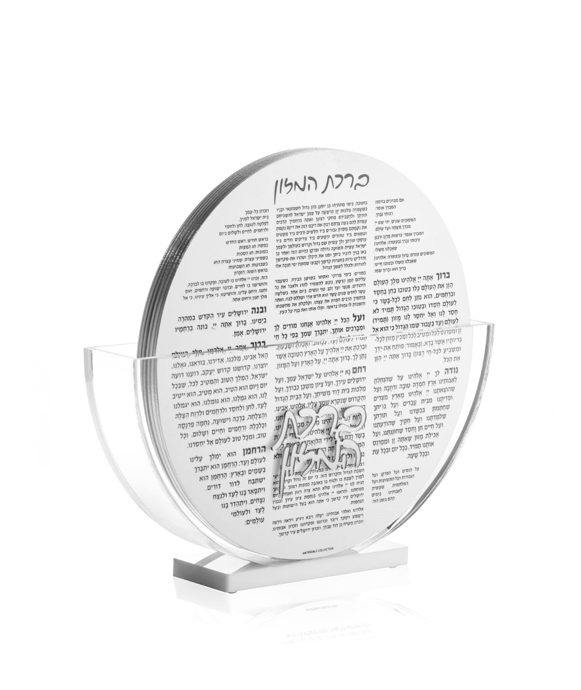Luxurious white Lucite Bencher Cards in a modern round clear holder with mirrored words. Double sided White lucite with Al Hamichya & Borei Nifashos, Easy to read. Wipe clean. Looks Great Personalized!!!!